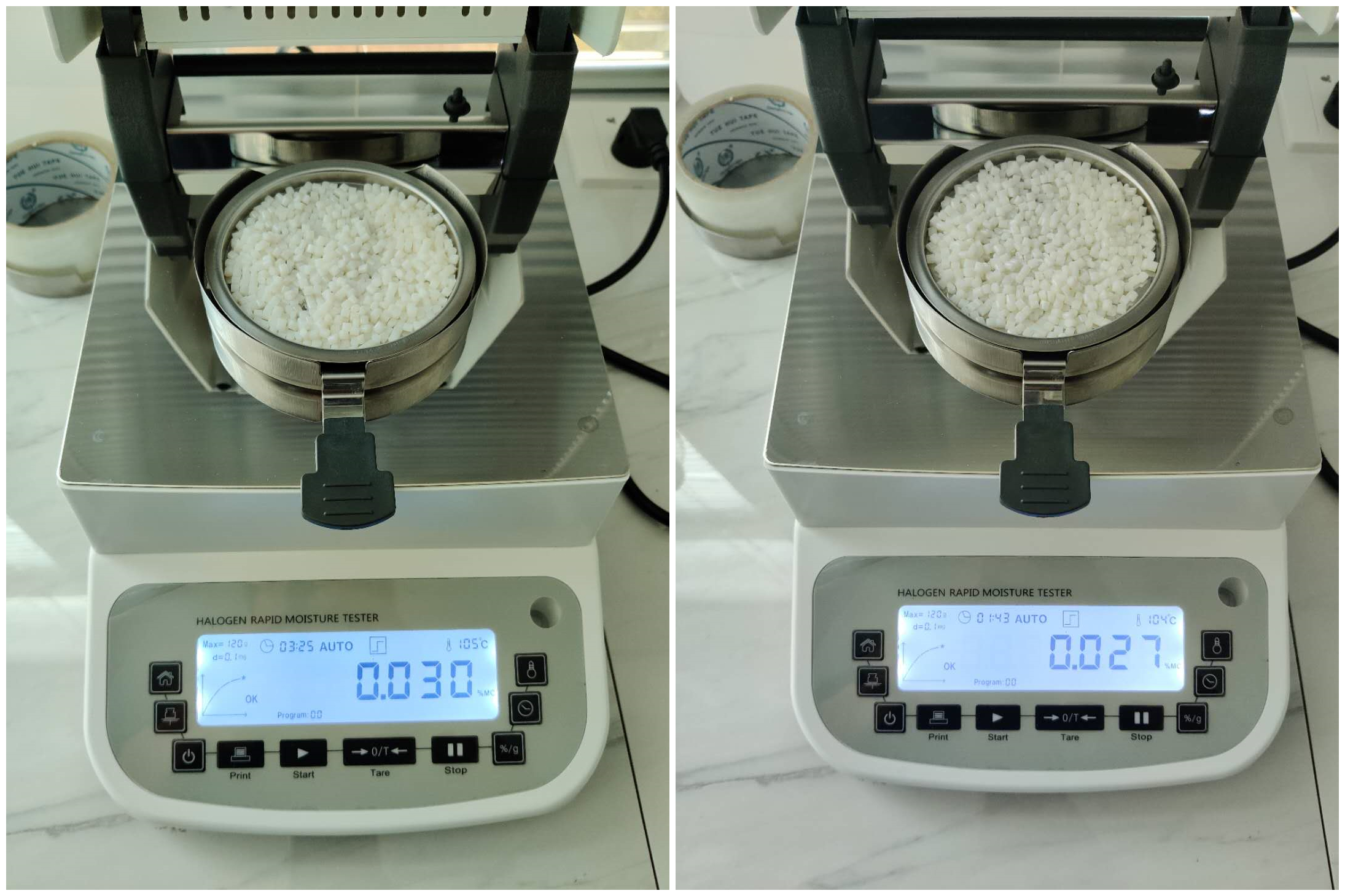 測(cè)試目的:水分含量是影響塑料加工工藝、產(chǎn)品外觀和產(chǎn)品特性的一個(gè)重要因素,在注塑過(guò)程中,如果使用含水量過(guò)高的塑料顆粒進(jìn)行生產(chǎn),會(huì)使最終產(chǎn)品出現(xiàn)開(kāi)裂、反光、抗沖擊性能和拉伸強(qiáng)度降低等問(wèn)題,影響產(chǎn)品質(zhì)量。所以檢測(cè)塑料顆粒的水分是塑料生產(chǎn)過(guò)程中一道重要的步驟。