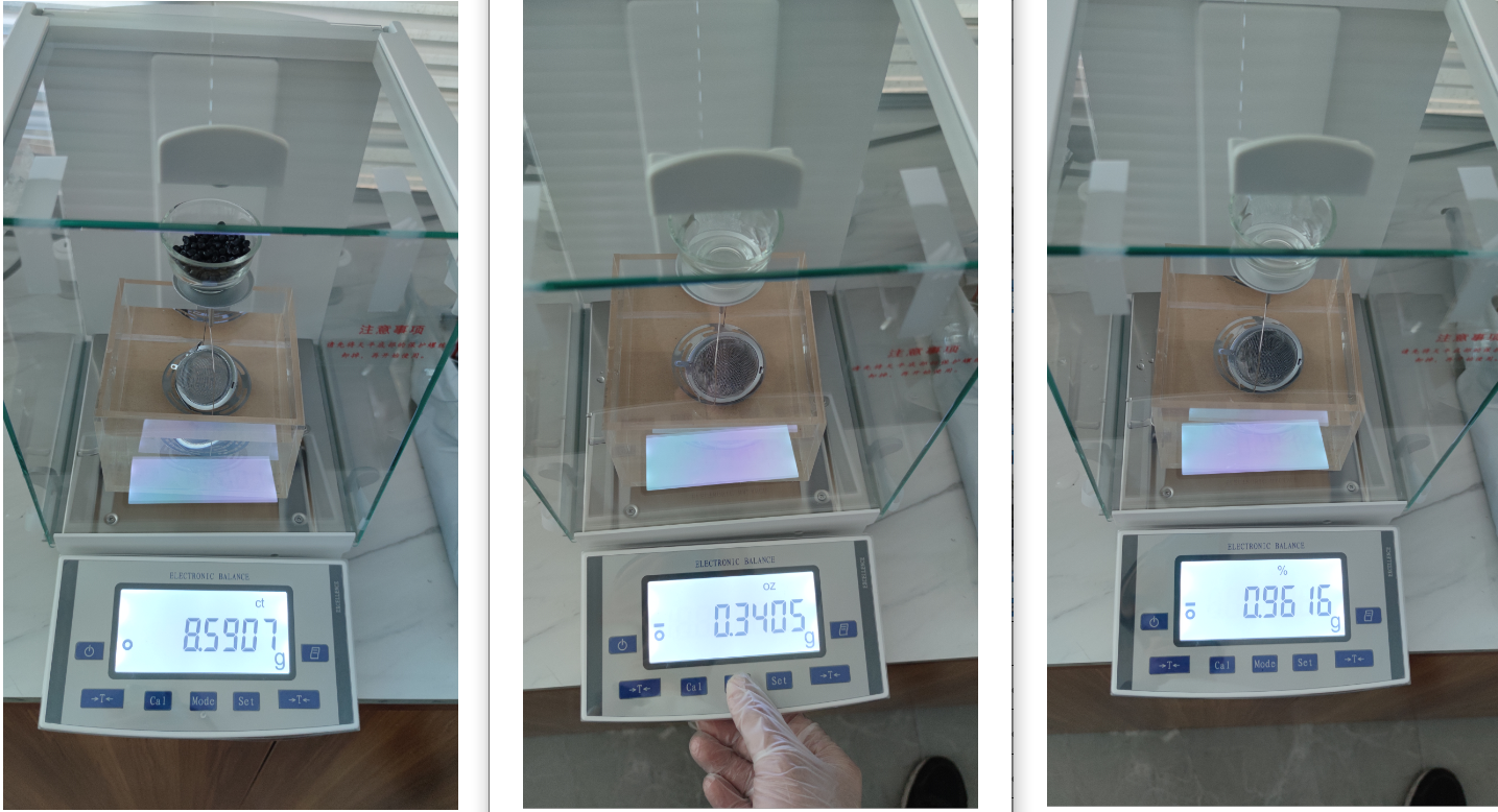 • 用實驗勺往稱量臺上的玻璃杯裝入5907g塑料顆粒,待儀器穩定后按下Mode鍵記錄塑料顆粒在空氣中的重量;