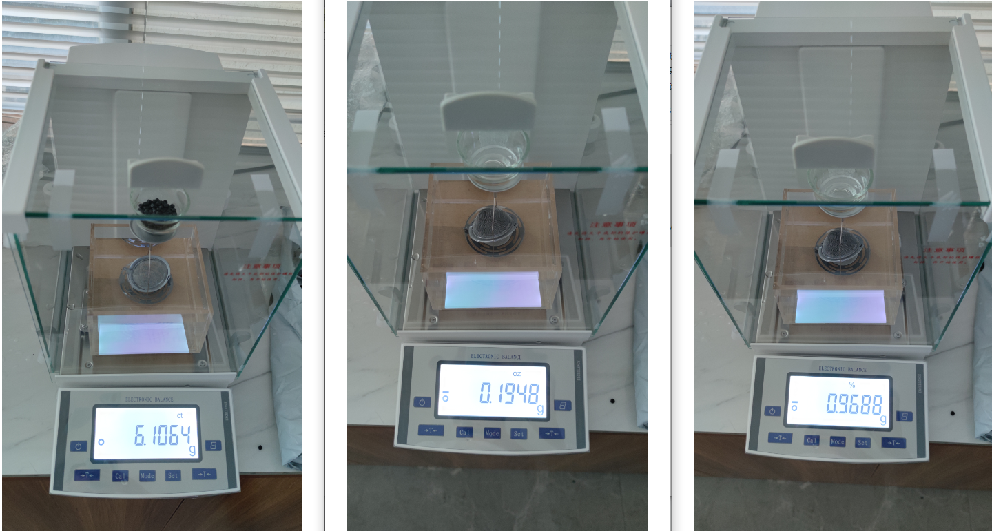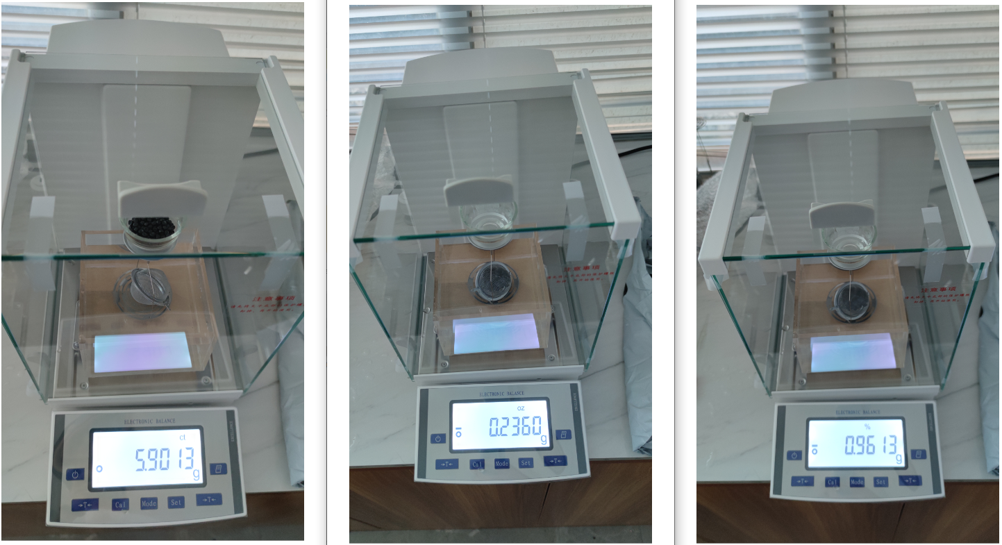 • 重復測試步驟,檢查密度計的重復性,第二次測試得出結果為9688g/cm?,第三次測試的結果為0.9613g/cm?,兩次重復測試的結果與第一次結果的最大誤差僅為0.075,重復性好。