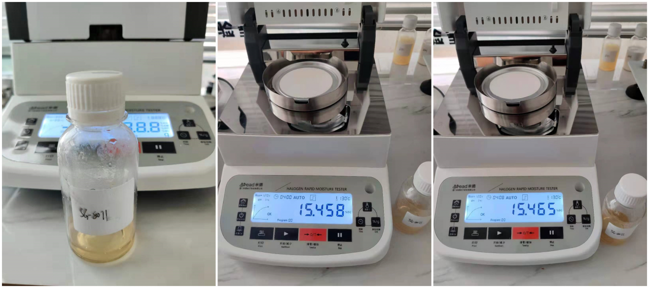 樣品為膠水,可以在無水甲醇與二甲苯混合溶劑中直接檢測水分,采用萊斯徳膠水水分儀測試。