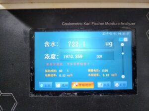 3.6、初次使用新鮮的庫侖電量法卡爾費休試劑含有過量的碘,顏色為深紅色,儀器中間提示過碘狀態,然后用微量注射器抽取20~50ul的純水從加樣口緩慢加入反應杯液面以下,直至反應杯內液體顏色變淡黃色,儀器左上方提示過水,含水量顯示值開始計數,停止加水,如果加入過多的水會導致電解平衡需要較長的時間。