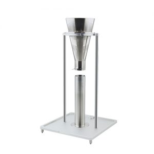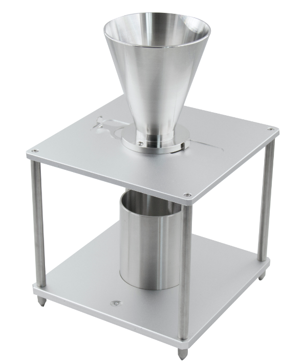 測定裝置原理:粉塵從漏斗口在一定高度自由落下充滿量杯;測定松裝狀態(tài)下量杯內(nèi)單位體積的質(zhì)量,即堆積密度。